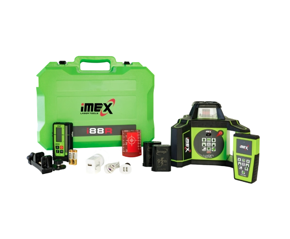 iMEX i88R merupakan laser rotasi profesional berkas merah (Red Beam) yang dilengkapi fitur lengkap untuk aplikasi konstruksi, sipil, dan alat ukur lapangan profesional. Alat ini mendukung pengukuran horizontal & vertikal, pemiringan manual (slope), mode scan, dan dilengkapi detektor digital mm-reading.
