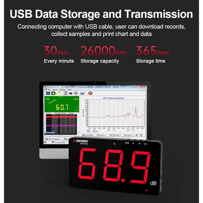 SNDWAY SW‑525D Sound Level Monitor Data Transfer adalah alat pengukur tingkat kebisingan suara yang dirancang untuk memantau dan mencatat level decibel (dB) di lingkungan seperti gedung, pabrik, ruang kerja, atau area publik. Perangkat ini dilengkapi dengan kemampuan transfer data ke komputer sehingga hasil pengukuran bisa disimpan dan dianalisis lebih lanjut. Rentang pengukurannya mencakup suara dari 30 hingga 130 dB, cocok untuk kebisingan lingkungan umum hingga suara yang sangat keras.